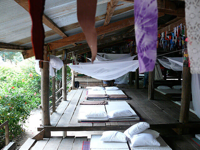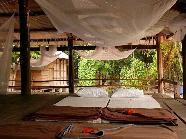 Vélo à travers la jungle, la prairie de calcaire et de hautes herbes pour découvrir le site exceptionnel de Srah Dumrei, grès monolithique de 6 m de haut du Xème siècle, représentant des éléphants et des lions. Déjeuner dans le village de Prehan Thom, ensuite départ sur la route du Sud au sommet de la montagne, entourée par la jungle et la prairie pour rejoindre le village de Ta Penh. Nuit dans la pagode de Wat Thmei. (Possibilité de compléter une boucle de +40 km sur la montagne)