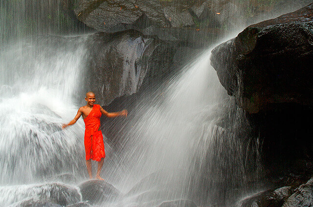 Transfert et vélo à Phnom Kulen, la montagne sacrée des Khmers. Vous voyagez à travers la campagne et les villages entourés de rizières et de palmiers. Après-midi, prendre un bain sous la cascade et visite de la rivière sculptée et la pagode au sommet de la montagne. Nuit dans une tente ou dans la pagode au sommet de la colline.