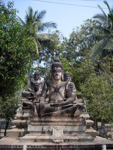 Visit of Wat Phnom. Legend relates that Daun Penh, a wealthy widow, found a large koki tree in the river. Inside the tree she found four bronze statues of the Buddha. Lady Penh constructed a small shrine on an artificial hill made by the people living in the village to protect the sacred statues. Eventually this became a sacred site and sanctuary where people would make blessings and pray.